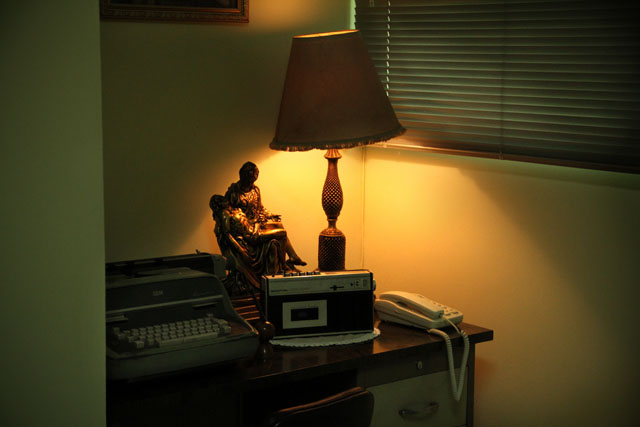 | Monseñor Romero no poseía muchas cosas y su habitación lucía austera. En un rincón tenía este escritorio y sobre él una lámpara, una réplica de "La Piedad", de Miguel Ángel, un teléfono, una radiograbadora y una máquina eléctrica de escribir marca IBM. |