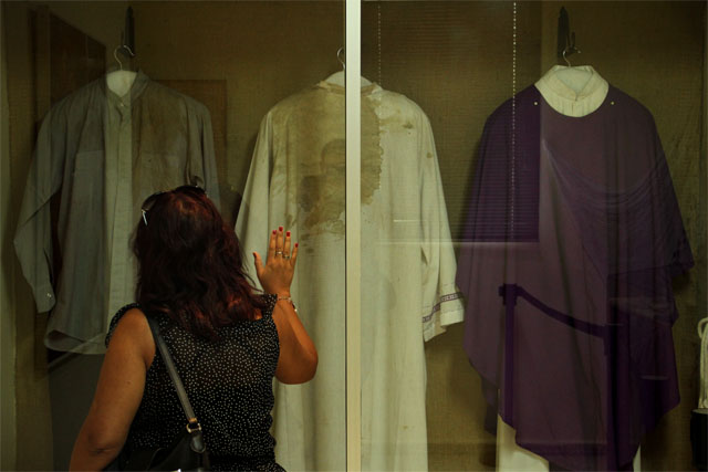 | Una visitante del museo medita ante la ropa ensangrentada que monseñor Romero usaba el 24 de marzo de 1980 en el instante del homicidio. |