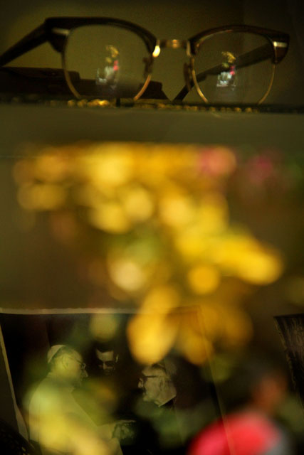 | Una fotografía de monseñor Romero saludando al papa Pablo VI y sus anteojos de gruesa armazón se muestran dentro de una vitrina. |